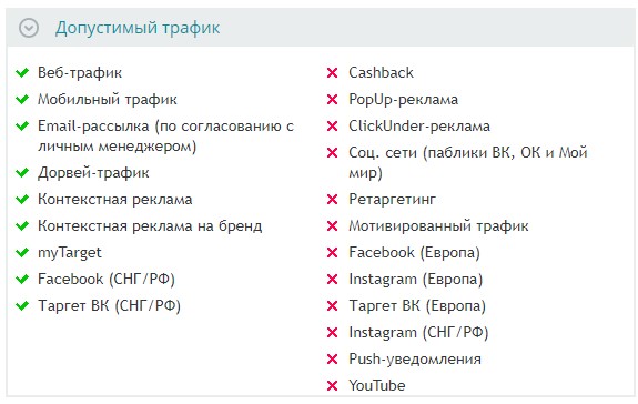 Принимается десктопный трафик. По некоторым офферам оплачивают и мобильный. Информацию об этом можно увидеть в офферах, возле каждого отдельного предложения.