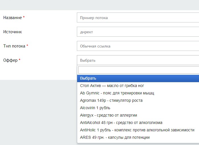 Кроме того, создать поток можно прямо из меню офферов.